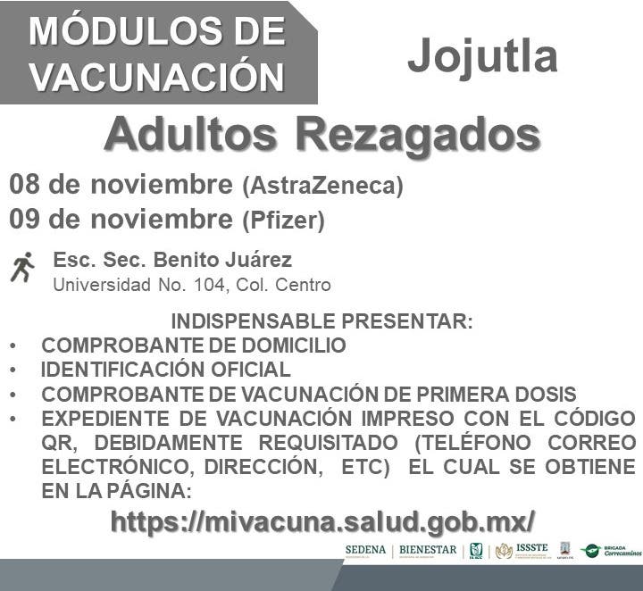 En Jojutla, la aplicación de AstraZeneca para personas rezagadas mayores de 18 años se realizará el lunes 8 de noviembre a partir de las 10:00 a.m. y hasta concluir las dosis asignadas en: