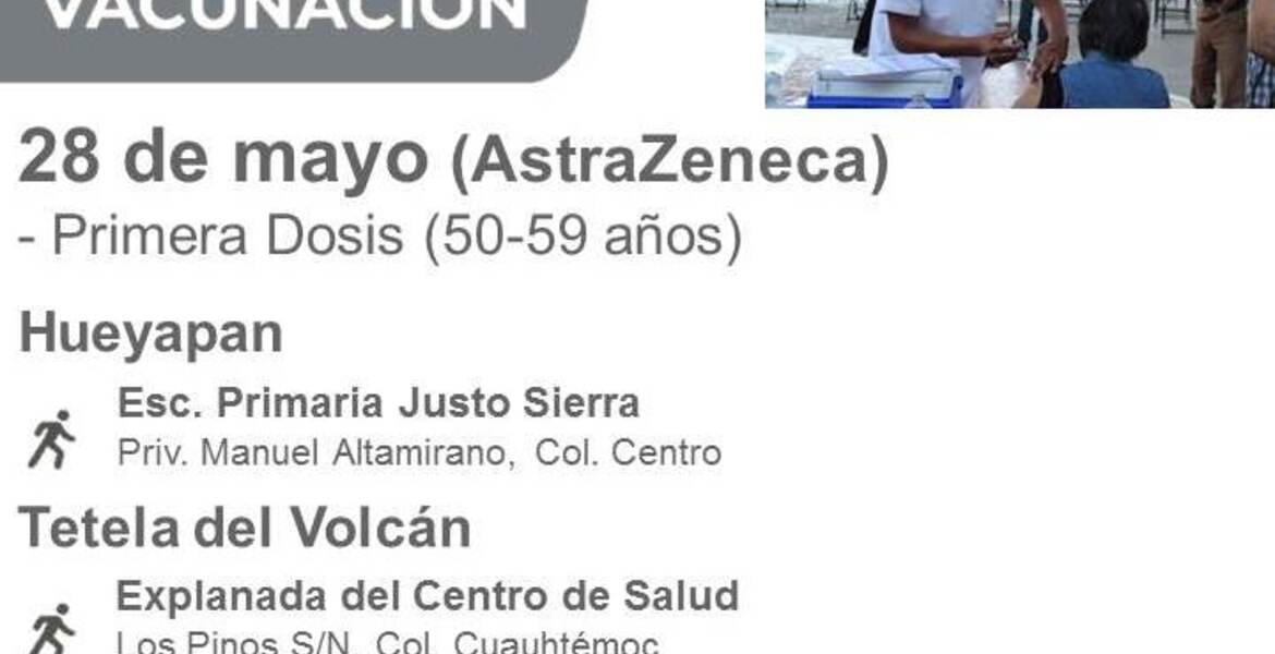El Coordinador del Plan Nacional de Vacunación contra COVID-19, indicó que este viernes 28 de mayo corresponde la aplicación del biológico a los habitantes de los altos del estado de Morelos, que comprende los municipios de Hueyapan y Tetela del Volcán, también, dijo que en estos municipios se aplicarán mil 850 dosis de la vacuna AstraZeneca, esto como parte de las etapas de inmunización establecidas para cada rango de edad en todo el país.