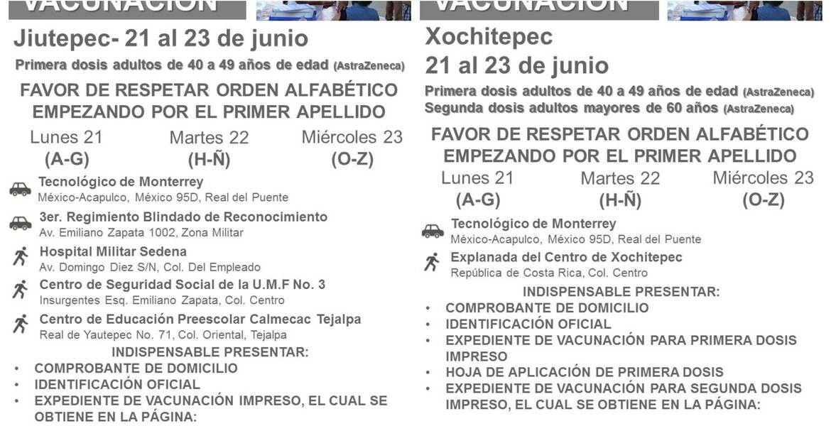 La Brigada Correcaminos que integra la Secretaría de la Defensa Nacional (SEDENA), la Guardia Nacional (GN), la Secretaría de Bienestar, la Secretaría de Salud del estado de Morelos, el Instituto Mexicano del Seguro Social (IMSS) y el Instituto de Seguridad y Servicios Sociales de los Trabajadores del Estado (ISSSTE), indicó que es importante que la población de Jiutepec y Xochitepec entre 40 a 49 años de edad, presenten para la aplicación de su primera dosis una identificación oficial, comprobante de domicilio para verificar que son residentes de estos municipios, su expediente de vacunación, el cual podrán obtener en la página de Internet https://mivacuna.salud.gob.mx/ ser llenado y posteriormente imprimirlo para mostrarlo en las sedes y así agilizar la vacunación.
