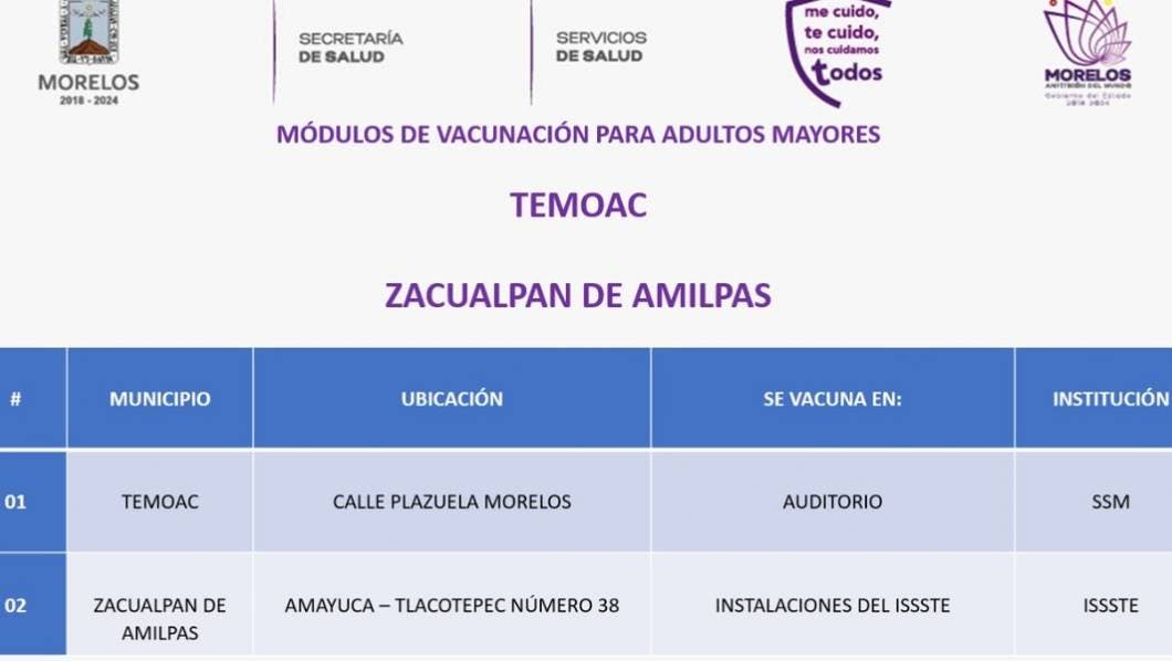 La institución sanitaria detalló que el punto de vacunación en Temoac estará ubicado en el auditorio que se encuentra en la calle Plazuela Morelos; en tanto, en el municipio de Zacualpan de Amilpas, la brigada de inmunización se encontrará en las instalaciones del ISSSTE, con domicilio en Amayuca – Tlacotepec número 38.