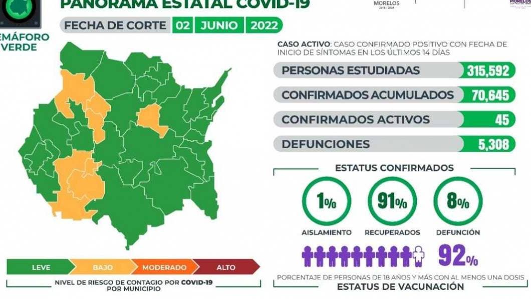 La Secretaría de Salud informa que a la fecha en Morelos se han estudiado 315 mil 592 personas, de las cuales se han confirmado 70 mil 645 con coronavirus COVID-19; 45 están activas y se han registrado 5 mil 308 defunciones.