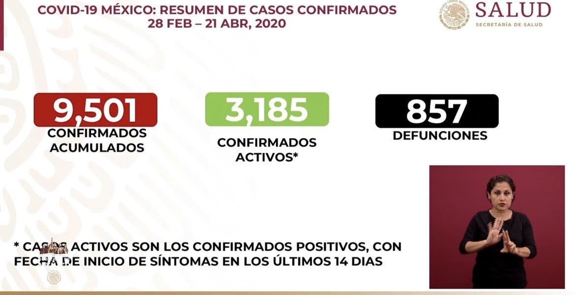 Al corte de las 19:00 horas del martes, se registran en el país 857 decesos, así como 9 mil 501 casos confirmados acumulados.