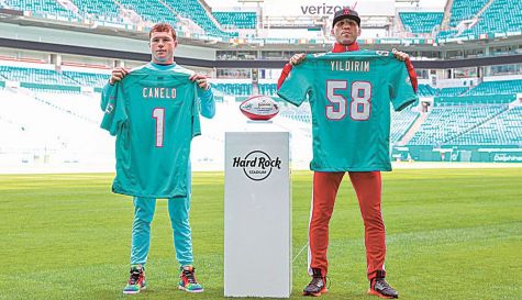 Ambos pugilistas aparecieron con el jersey de Miami Dolphins, equipo que juega en dicho inmueble, en una singular presentación ante la prensa lejos de lugares cerrados; ahí el Canelo destacó las cualidades de su rival.