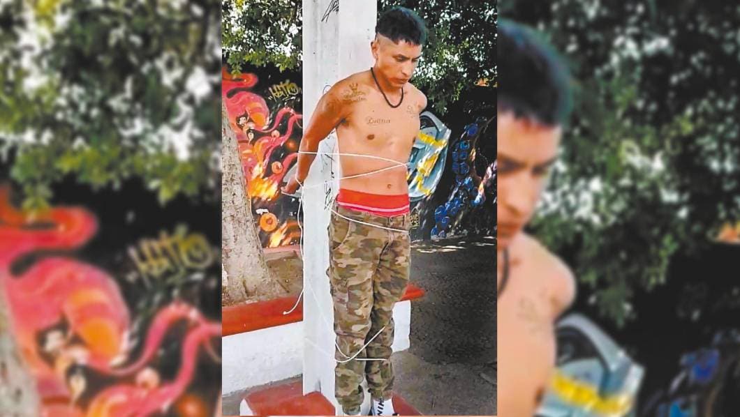 Cuernavaca, MORELOS.- Cansados de los robos y la inseguridad, vecinos de la colonia Lagunilla detuvieron a un presunto delincuente que al parecer intentó robar mercancía de una tienda, lo amarraron a un poste y le pusieron un mensaje.