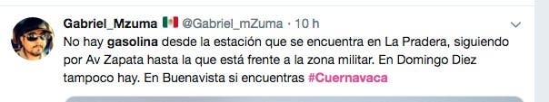 En otro mensaje en la misma red social, asegura que: En #Cuernavaca en la gasolineria de Chamilpa venden a $500 pesos el galón de 20 litros de ⛽ porque ya no hay gasolina en las bombas. Es decir a $25 pesos el litro. ¿Qué eso no es huachicoleo?"