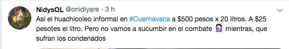 La foto que trascendió pertenece a la usuaria @onidiyare, quien asegura textualmente "Así el huachicoleo informal en #Cuernavaca a $500 pesos x 20 litros. A $25 pesotes el litro. Pero no vamos a sucumbir en el combate mientras, que sufran los condenados"