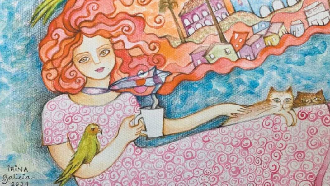 La acuarela abraza al invitado (pues caben todos en el arte) pero tiene cuidado y pone aparte al minino ansioso de bocados; y una musa de pelo colorado dibuja un paraíso de soslayo, un mundo que sirva como ensayo para vivir en paz la primavera y la vida se ofrezca placentera conjurando el gran furor de mayo.