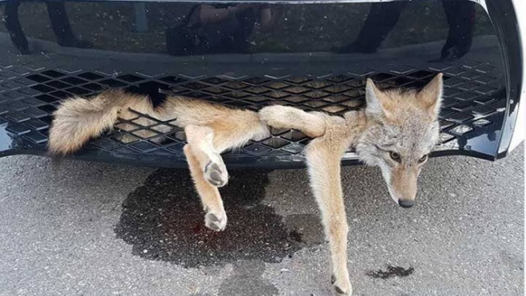 Un coyote viajó 35 kilómetros empotrado en la parte delantera de un coche y, aunque usted no lo crea, sólo tuvo lesiones leves.