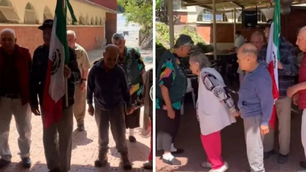 El tierno momento fue compartido por una usuaria de Tik Tok y ya suma más de 200 mil likes, pues es increíble ver el intento y emoción que produjo en estos abuelitos ponerse a marchar junto a sus amigos y portando la Bandera de México.