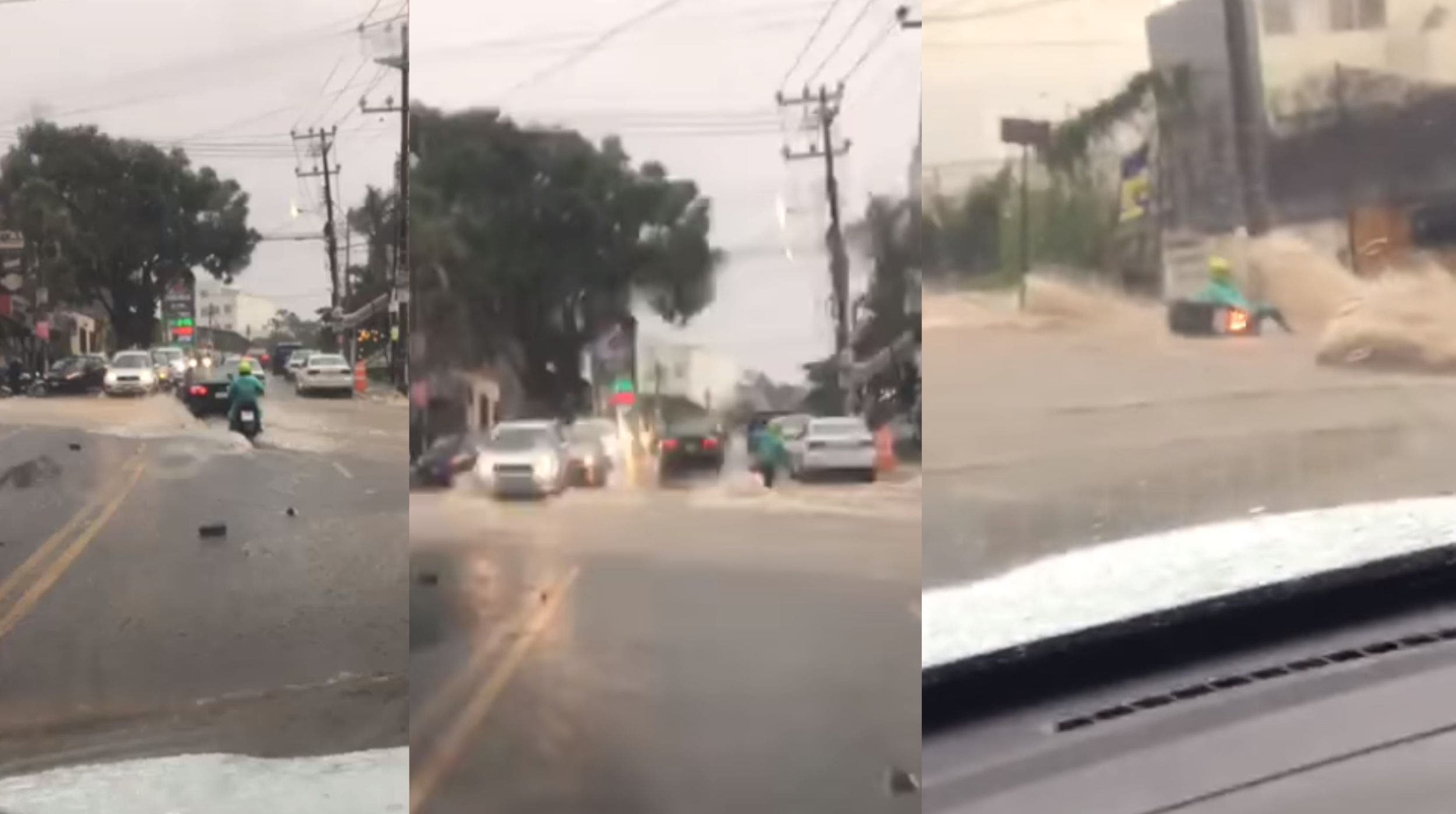 Fue un automovilista que captó en video justo el momento en que un motociclista quedó varado en la corriente, para luego ser arrastrado.