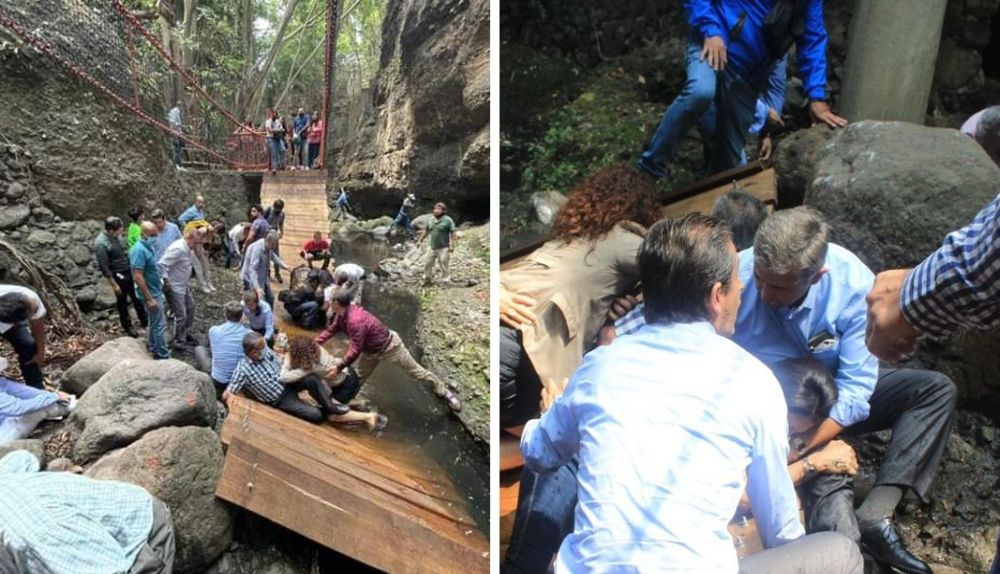 Este fue el momento exacto en el que colapsó el puente en la reinauguración del Paseo Ribereño en el Parque Porfirio Díaz en #Cuernavaca.