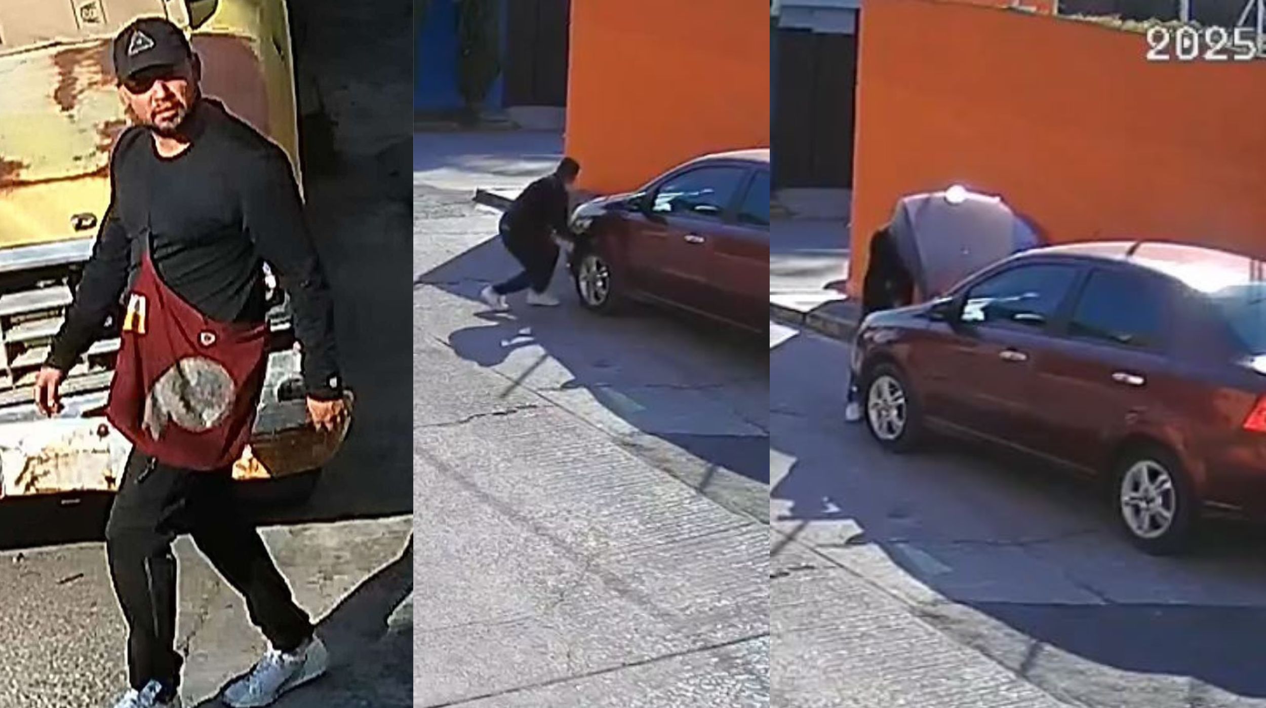 El conductor de un coche blanco aparece en la grabación y se detiene a poca distancia, mientras el primer sujeto abre el cofre del Aveo y en segundos roba la computadora del vehículo.