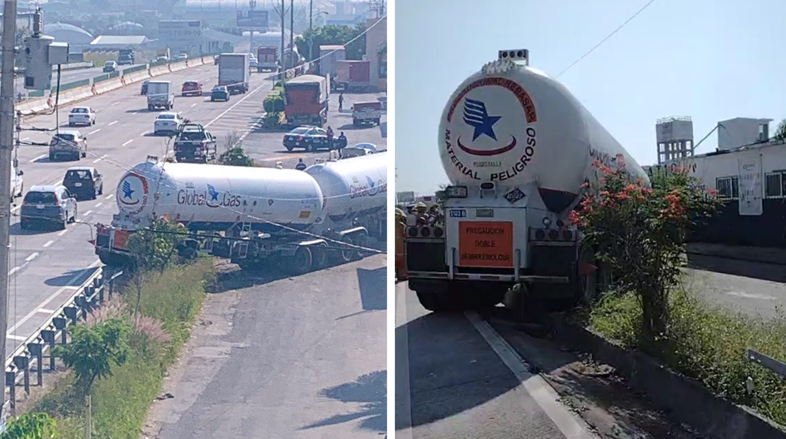 Esta mañana de martes una pipa de doble remolque que transportaba gas lp sufrió un accidente, provocando que se saliera del camino, aproximadamente en el km 83 del Paso Exprés en Cuernavaca con dirección al sur de la entidad.