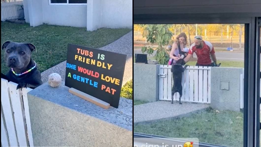 A pesar de que algunos no son tan cariñosos con la gente extraña, existen otros que añoran una caricia aunque no provenga de sus amos, tal como es el caso de la perrita llamada Tubs, una perrita de raza Bull Terrier que vive en Townsville, Austrlia, quien tenía un letrero frente a la casa donde vivían sus dueños que decía, “Tubs es amistosa, le fascinaría una suave caricia”
