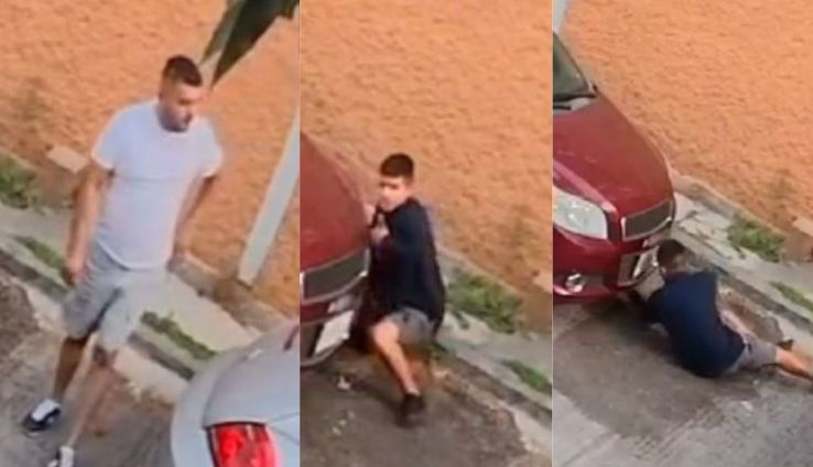 Posteriormente, el otro sujeto se dirige a un auto Aveo color rojo, hurga por debajo del motor hasta que logra abrir la cajuela y se lleva la computadora.
