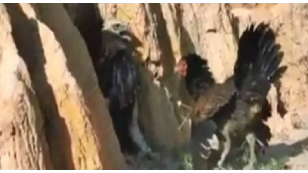 Como es usual cuando van a cazar, el águila aterrizó en el nido en picada a una gran velocidad, pero la gallina esquiva ese primer golpe y la recibe con una sarta de garrazos, picotazos y empujones que terminan por someter al águila contra una superficie rocosa.