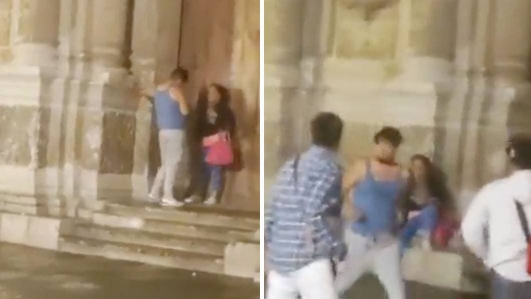 De manera pública, un sujeto fue captado en video cuando a fueras de la Catedral de Oaxaca, agredía a una mujer. El individuo aparentemente era pareja de la fémina, quien a la vista de todos no dejaba que se fuera del lugar hasta que algunos hombres se percataron del suceso para interrumpir.
