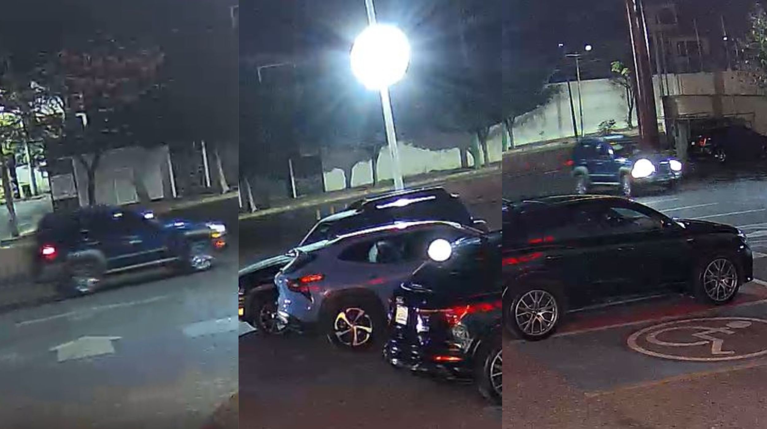 En las imágenes, se observa cómo la camioneta azul, con vidrios polarizados y permiso para circular, maniobra en el área iluminada por faroles, deteniéndose cerca de vehículos estacionados.