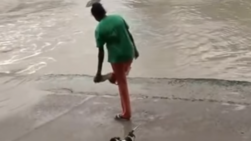 Al percatarse de la presencia del reptil, la mujer se quitó una de sus chanclas y la azotó contra su mano lo que provocó que el cocodrilo se asustara y se alejara del lugar.