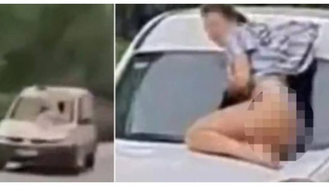 En las imágenes se puede apreciar cómo la mujer se sujeta fuertemente del capó mientras el vehículo avanza por una carretera a toda velocidad.