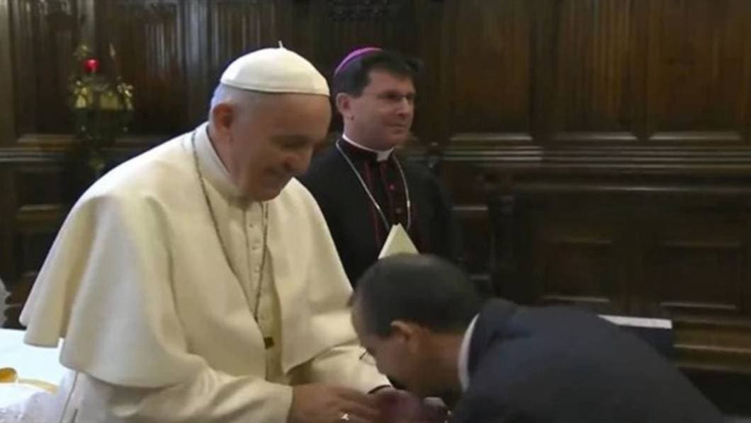 Un encuentro en el que, tal y como puede observarse en los vídeos, evita que varios fieles que se acercaron a saludarle besen el anillo, que lleva en la mano derecha, el momento ya se hizo viral en redes sociales.