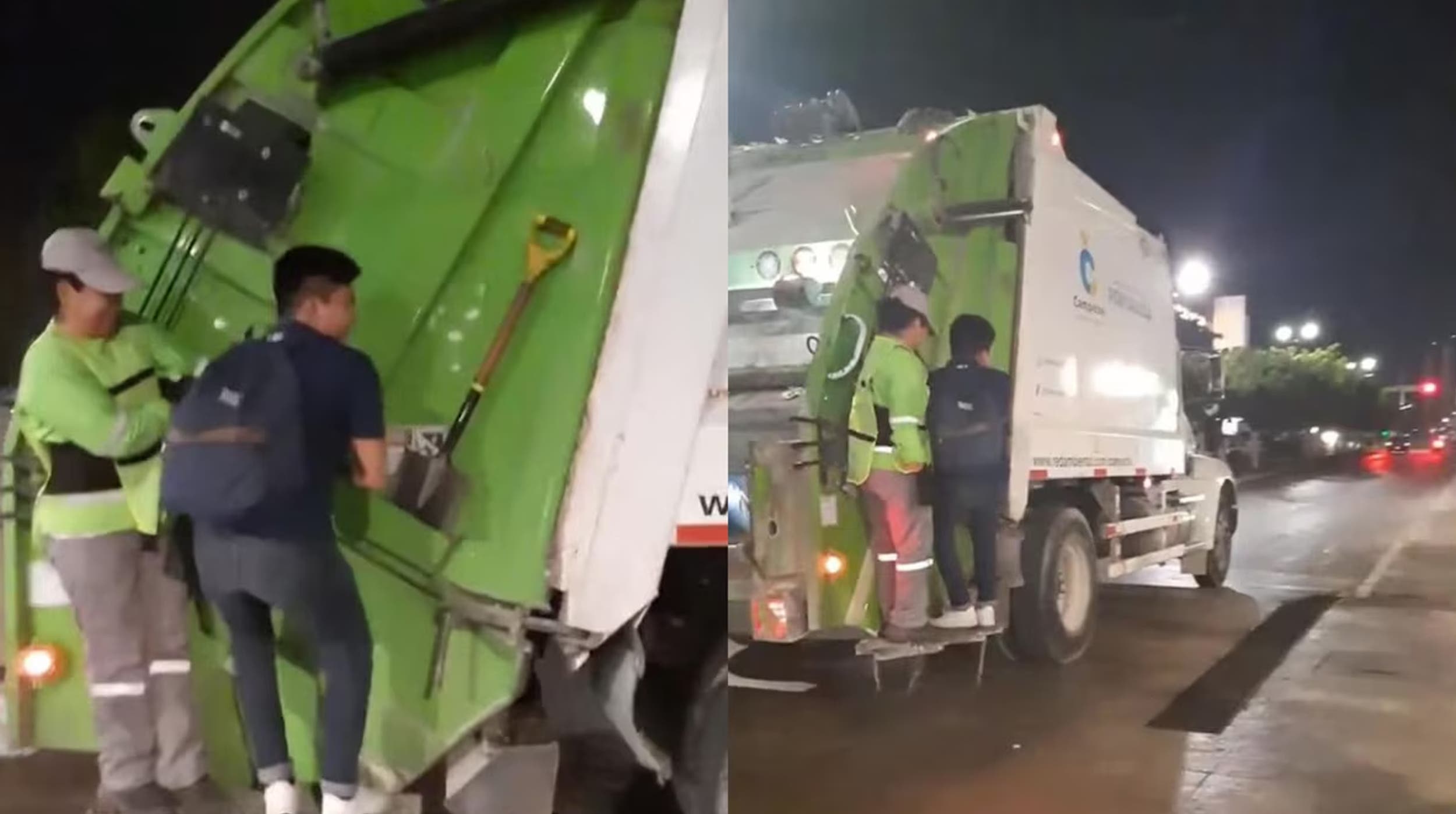 El video, compartido en TikTok por la usuaria @przligi, muestra el momento en que el joven se sujeta del camión de basura junto a uno de los empleados del servicio de limpieza, quienes decidieron ayudarlo llevándolo gratuitamente en su ruta.