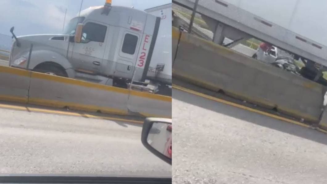 Primeros informes indican que un tráiler doble semi remolque embistió a un auto color gris, cuyos ocupantes quedaron prensados.