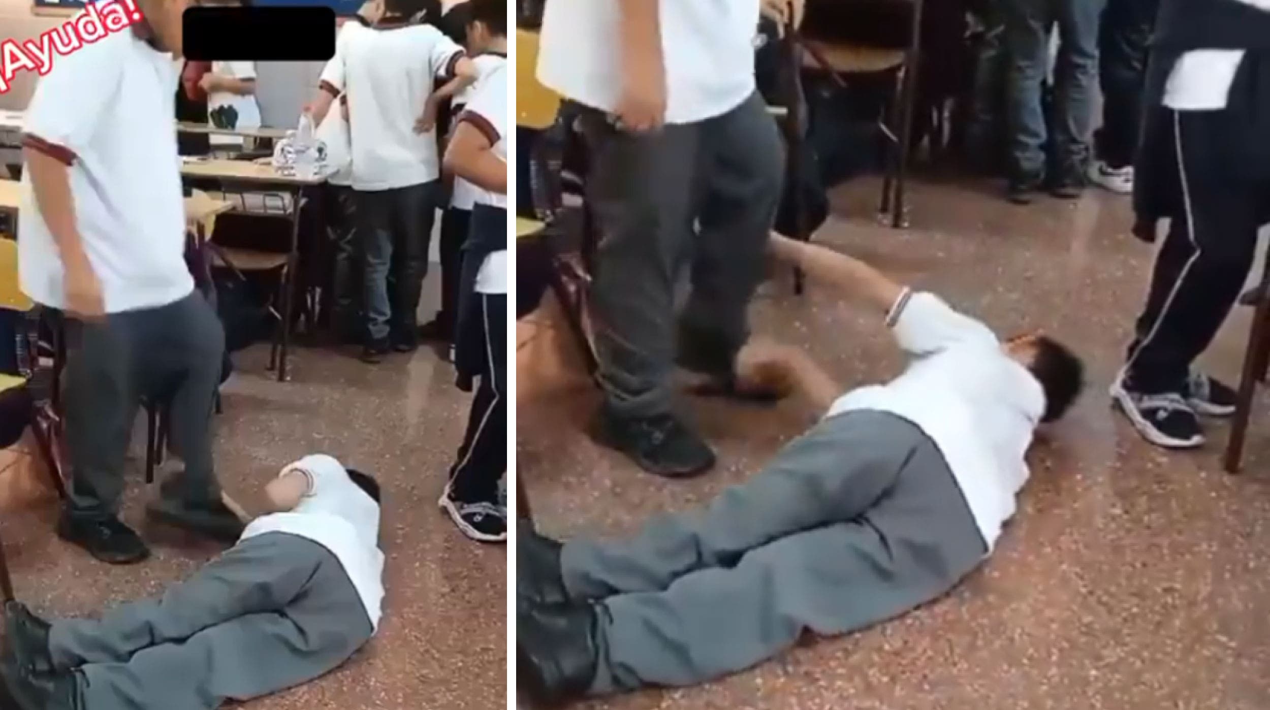 En el video que dura siete segundos se ve un niño de espaldas tirado en el suelo, casi inmovilizado de sus piernas, mientras otro lo patea repetidas veces, el niño agredido intenta poner las manos para defenderse al mismo tiempo que grita “suéltame” sin obtener respuesta.