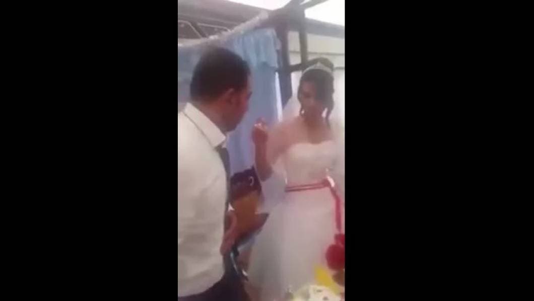 El hombre no tomó el gesto con humor y le dio un manotazo a su esposa, lo cual acabó con el encanto del significativo momento. La mujer mostró un rostro de dolor y vergüenza ante sus invitados y agachó la mirada. El video ha sido compartido por los usuarios en Internet y acumula millones de reproducciones.