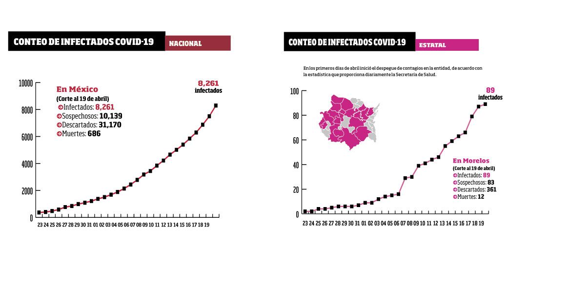La Secretaría de Salud estatal informó que hasta ayer, en Morelos, se han confirmado 89 casos de coronavirus COVID-19, descartado 361 y están como sospechosos 83; se han registrado 12 defunciones.