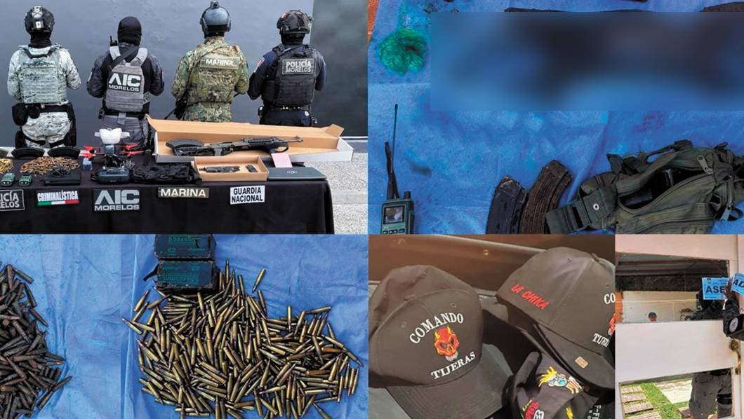 Armas, material explosivo, balas, un dron, vehículos y hasta un narcomensaje fueron asegurados durante un cateo de autoridades estatales en un predio de la colonia Lomas del Texcal. La Fiscalía General del Estado (FGE) informó que el pasado miércoles se realizó un operativo en un domicilio ubicado en la referida colonia, derivado de trabajos de investigación por hechos delictivos ocurridos en los últimos días en Jiutepec. El inmueble fue resguardado por elementos de la Secretaría de Marina, del Ejército Mexicano, Guardia Nacional (GN) y de la Secretaría de Seguridad y Protección Ciudadana (SSPC) como medida preventiva ante cualquier incidencia durante el cateo realizado por personal de la Agencia de Investigación Criminal (AIC). Al revisar la vivienda, se localizaron dos armas de fuego —una corta y una larga—, cartuchos útiles de diferentes calibres, un dron con el que presuntamente se realizaban labores de vigilancia por parte de supuestos delincuentes, una cartulina con un narcomensaje y tres vehículos. También se encontraron gorras con logotipos de “Comando Tijeras”, cargadores de distintas armas de fuego, una repetidora de video, credenciales, celulares, una computadora portátil y sustancias explosivas que quedaron a resguardo de la 24/a Zona Militar. Presuntamente, el domicilio era utilizado como casa de seguridad por integrantes de una célula delictiva que podría estar relacionada con algunos actos delictivos registrados en las últimas fechas en Jiutepec, quedando asegurado por la FGE.