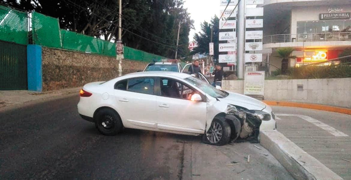 Un auto Renaul-Fluence, color blanco, acabó destrozado del frente, tras chocar contra un muro y un poste, luego de que el conductor volanteara para evitar impactarse de frente contra un coche que invadió su carril, cuando circulaba por la Calzada de los Reyes, a la altura de una conocida plaza en Cuernavaca.