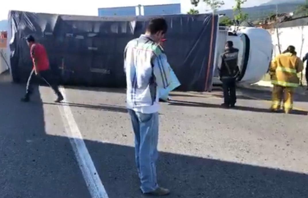 Al parecer por el exceso de velocidad y una falla en los frenos, el conductor de la unidad perdió el control y terminó volcado.