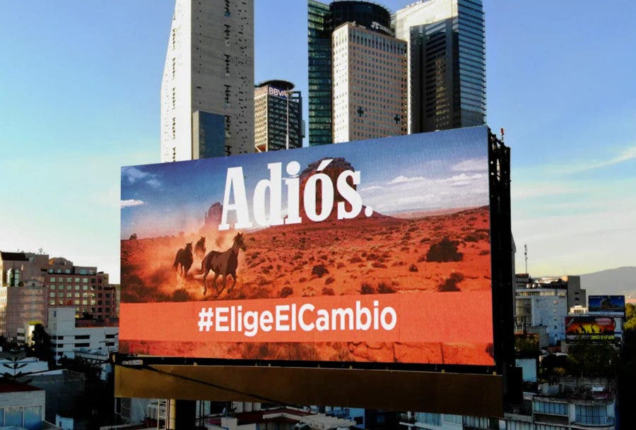 Este anuncio de Philip Morris viene acompañado de un anuncio espectacular con una imagen panorámica característica de las campañas de la publicidad de Marlboro. El afiche viene acompañado de la palabra “Adiós” y del hashtag #EligeElCambio.