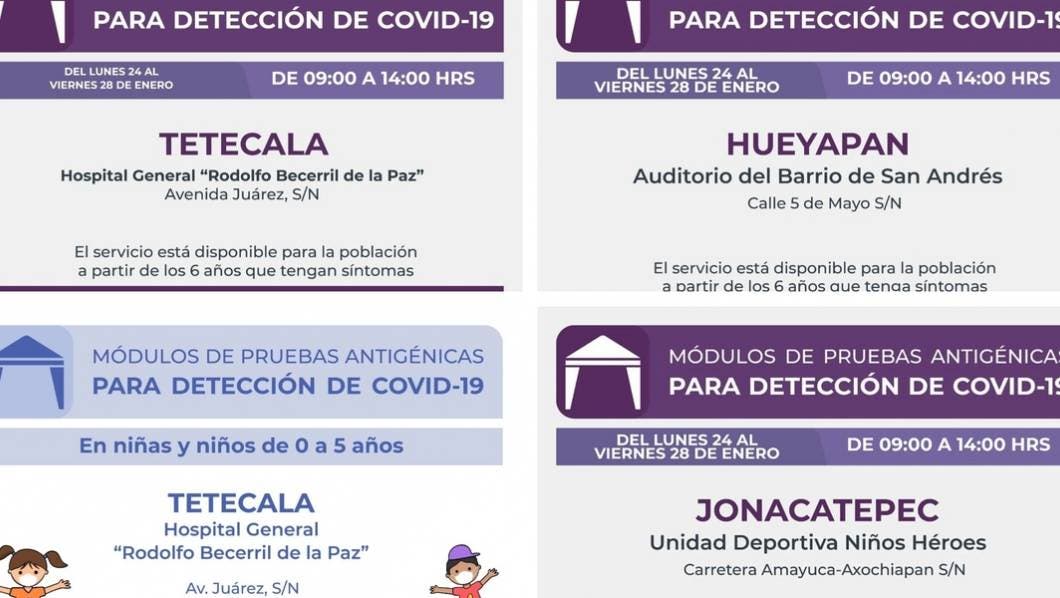 Asimismo, las pruebas antigénicas estarán disponibles en Hueyapan, en el auditorio del Barrio de San Andrés, calle 5 de Mayo, sin número, el servicio será para quienes tengan de seis años en adelante.