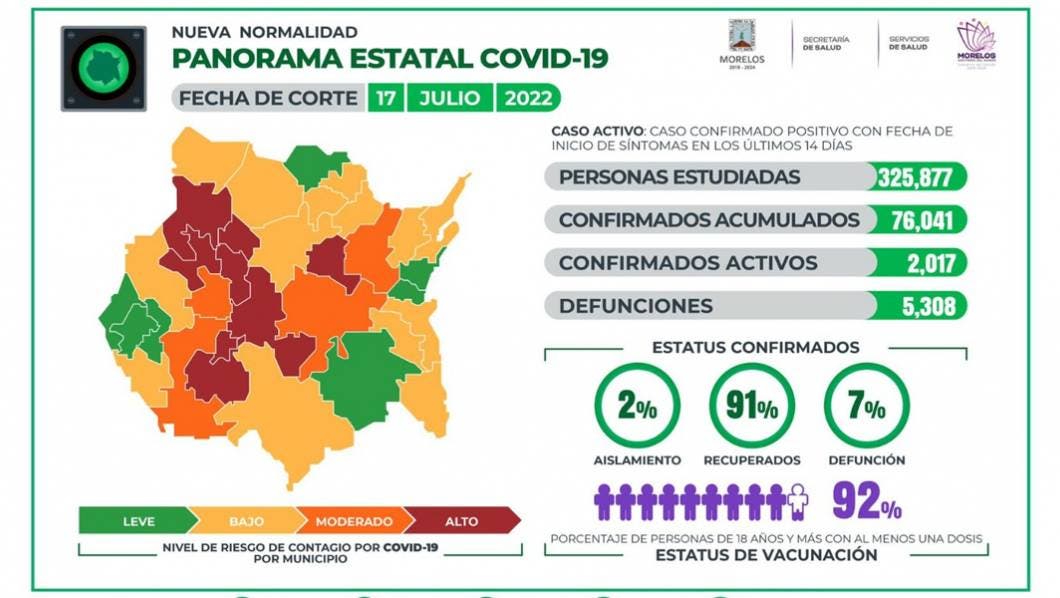 La Secretaría de Salud informa que a la fecha en Morelos se han estudiado 325 mil 877 personas, de las cuales se han confirmado 76 mil 041 con coronavirus COVID-19; 2 mil 017 están activas y se han registrado 5 mil 308 defunciones.