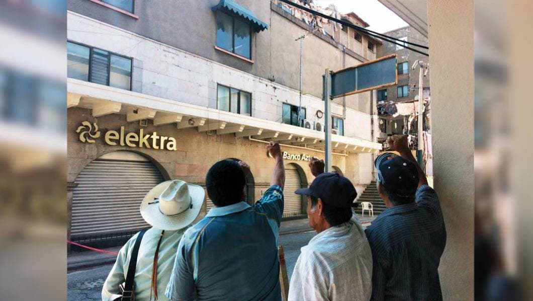 Escombros quedan sobre la Torre Latinoamericana. Arriba, 4 hombres alzan los puños, en señal de que el sismo no doblegó su fortaleza.